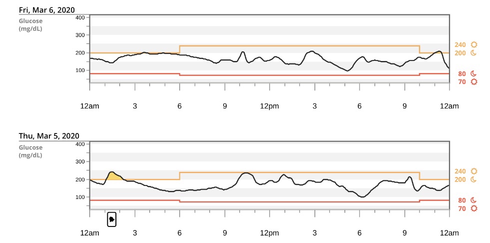 To help track blood sugar as an alternate to finger pricks, there are Continuous Glucose Monitoring charts. Here’s what two of my CGM charts look like on a range of 240 mg/dL high and 70 mg/dL low: